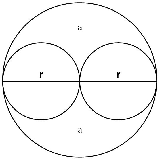 In this figure, each of the two smaller circles is equal to A/4, where A = the area of the circle. Each small circle has a diameter of one inch, and so is equal to one round inch. The area of the large circle is equal to (diameter)2. This value is equal to 22, which is equal to 4. So, the circle above has an area of four round inches.